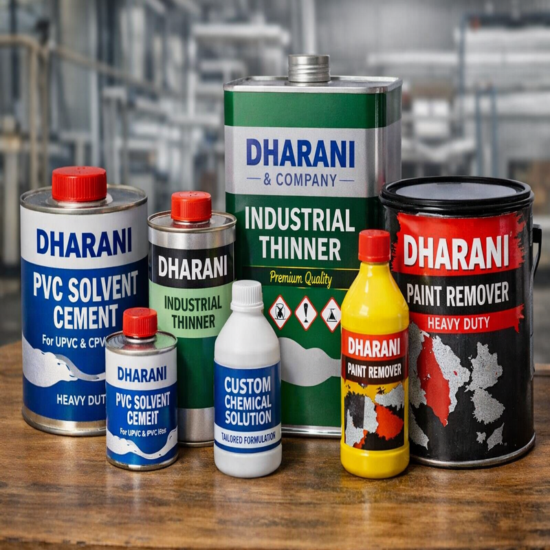Dharani and Company manufactures premium industrial thinners used extensively in paint dilution, coating applications, and surface finishing processes. These thinners ensure smooth application, proper viscosity, and uniform drying, making them ideal for automotive, industrial, and decorative painting purposes.